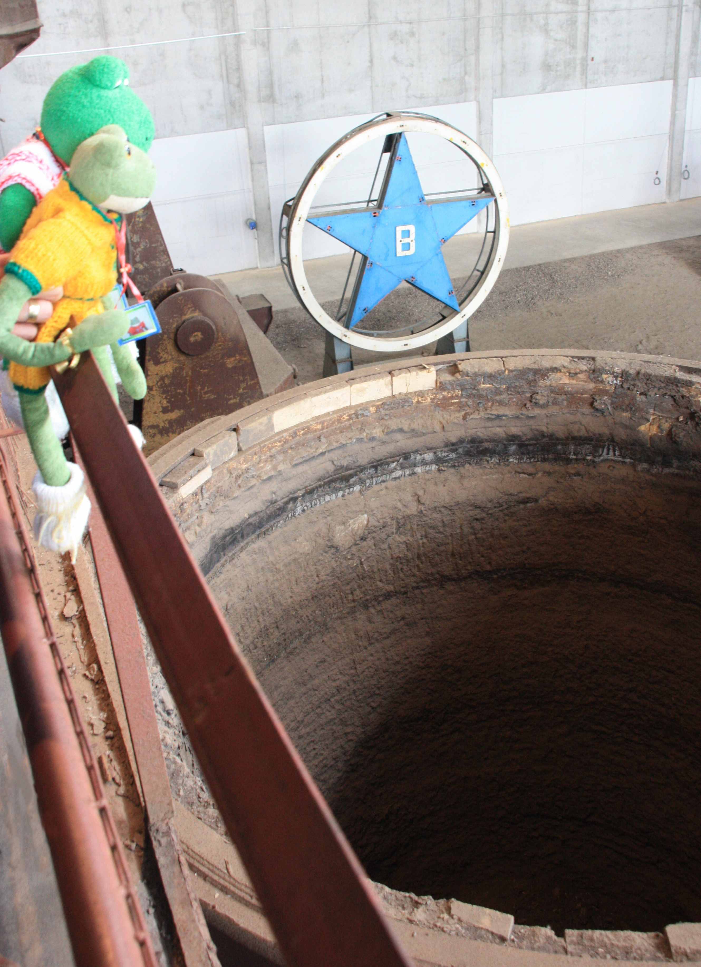 "In diese Pfanne floss der Stahl aus dem Ofen beim Abstich,es waren ca 180 Tonnen", erzählt Berti.Mondi ergänzt noch:"Der Stahl war kochendheiss, ca 1600 Grad Celsius.Alles in allem, eine heisse Sache."
