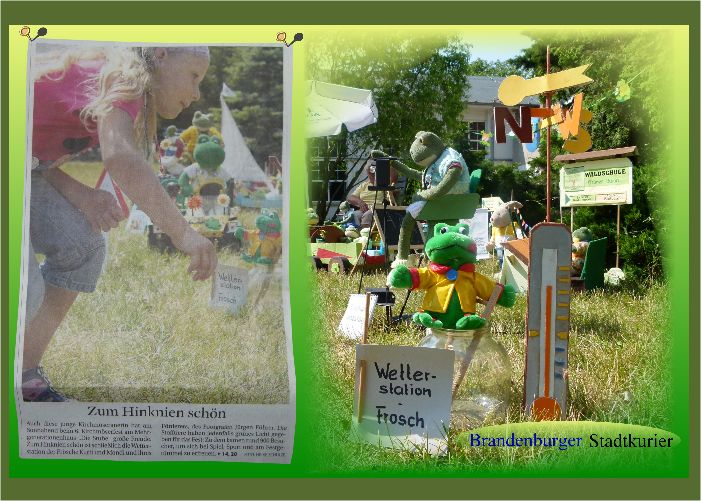 "Zum Hinknien schön" Auch diese junge Kirchmöseranerin hat am Sonnabend beim 6.Kirchmöserfest am Mehrgenerationenhaus"Die Stube" große Freude. Zum Hinknien schön ist schließlich die Wetterstation der Frösche Kurti und Mondi und ihres Förderers, des Fotografen Jürgen Führer. Die Stofftiere haben jedenfalls grünes Licht gegeben für das Fest:Zu dem kamen rund 900 Besucher , um sich bei Spiel, Sport und am Festgetümmel zu erfreuen. (Text MAZ)