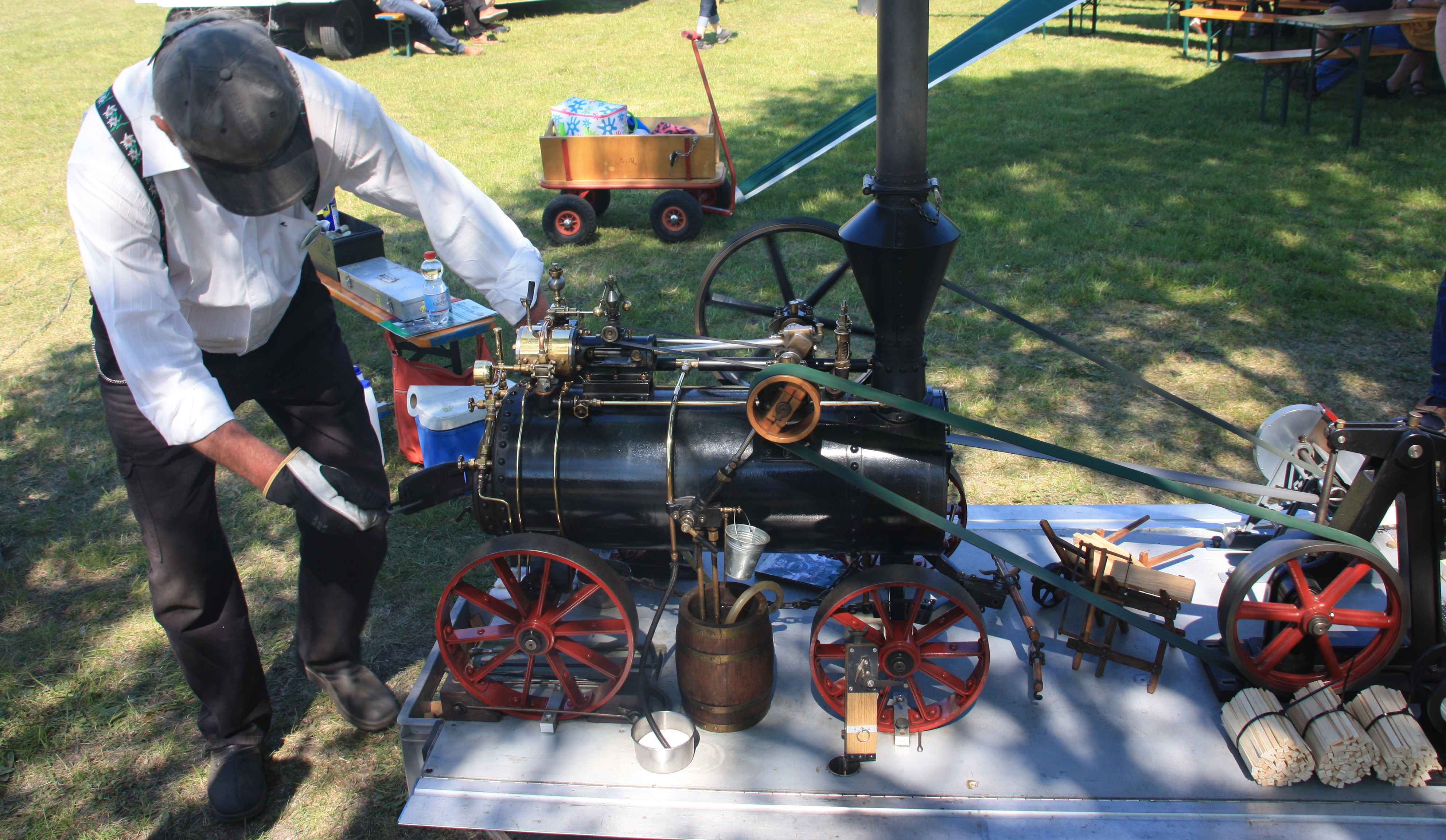 "Mit Hilfe der Dampfmaschine kann ich kleines Holz zersägen und spalten", erklärt der freundliche Maschinist.